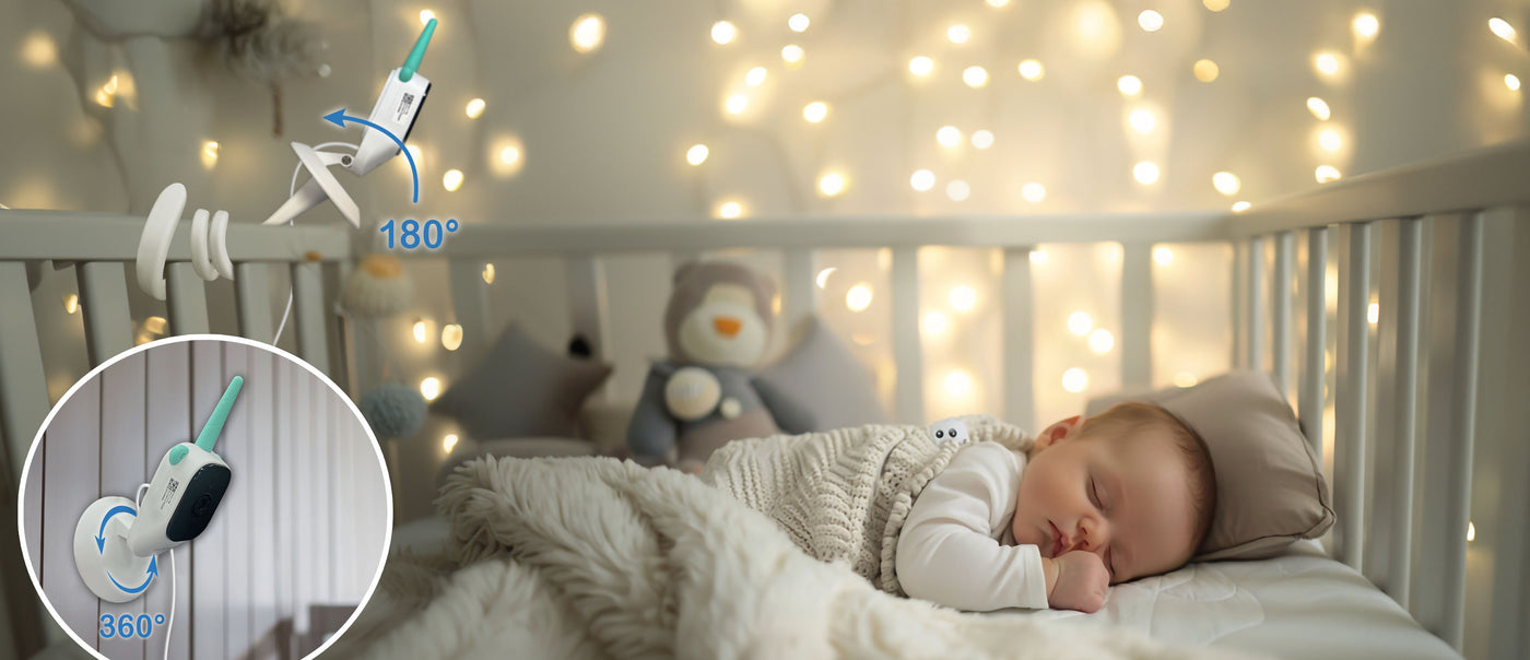 The camera is very easy to set up with possibility to rotate 360° horizontally and 180° vertically. A flexible crib stand is included in the package so you don’t need to drill any holes on your wall.