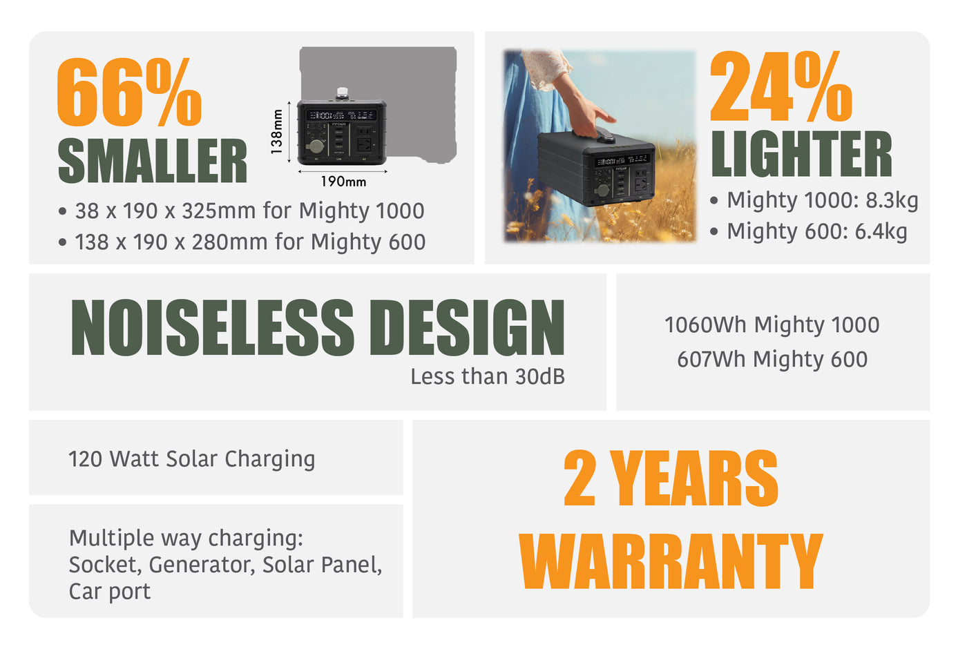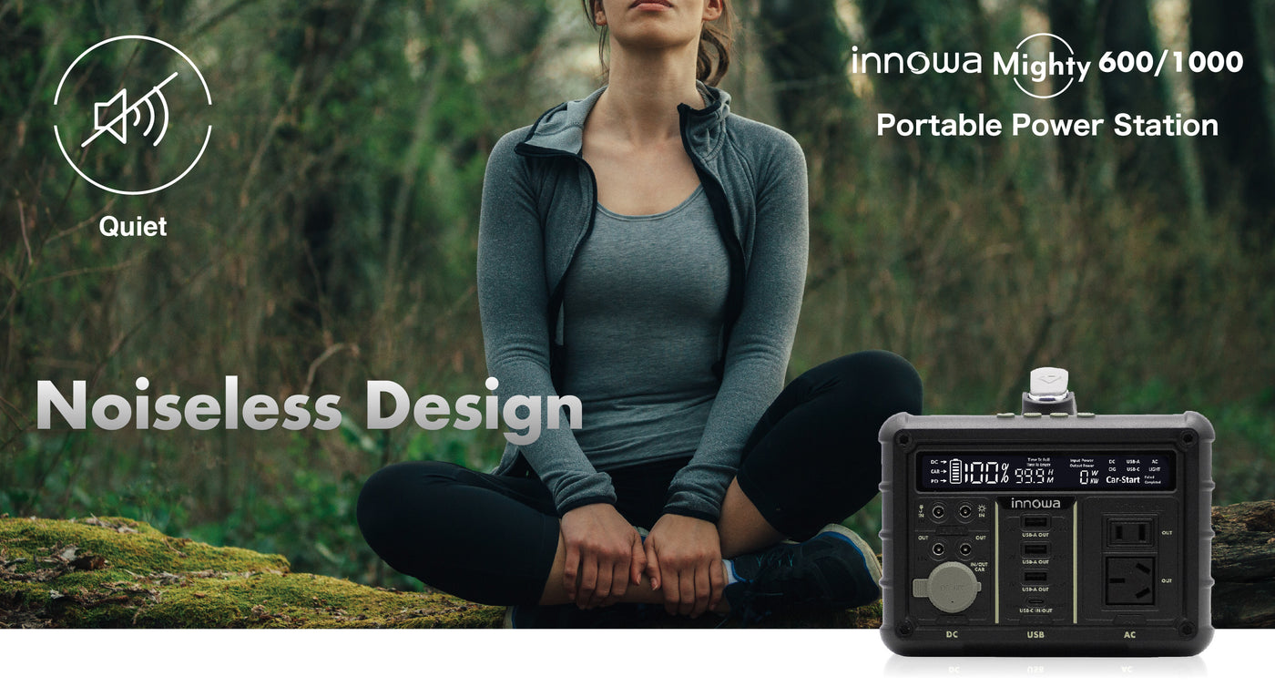 Introducing the innowa Mighty 600/1000 Portable Power Station - a compact, lightweight powerhouse offering unmatched portability, quiet operation, and diverse connectivity. 66% smaller than similar products and weighing only 6.4kg, it's easy to transport and store. Its fanless design ensures peaceful operation under 30dB, while multiple output options accommodate a wide range of devices.